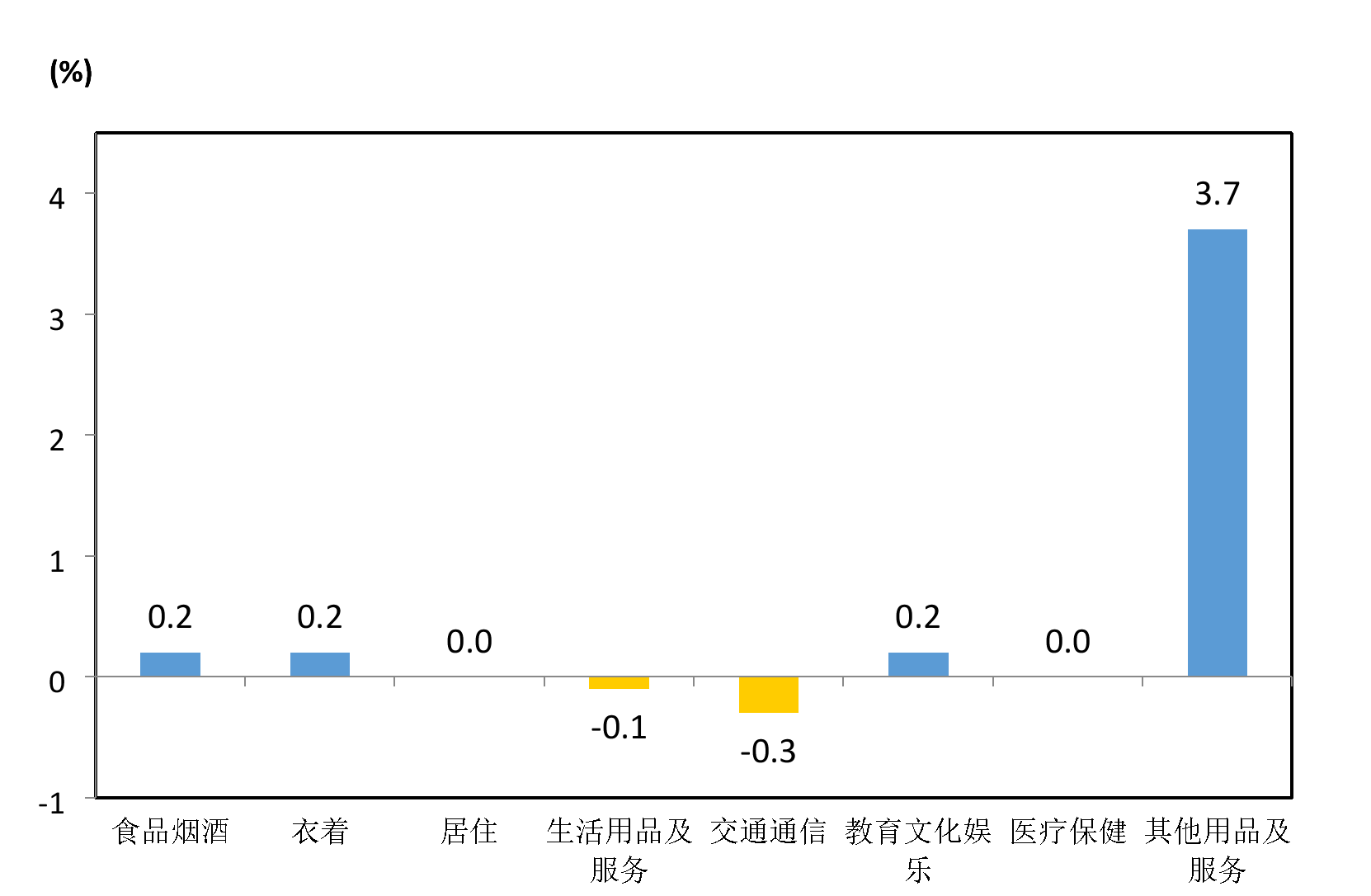 10月份,其他用品及服务、生活用品及服务、衣着、教育文化娱乐、医疗保健、居住价格分别上涨13.3%、2.3%、1.7%、0.9%、0.4%和0.3%;交通通信、食品烟酒价格分别下降1.9%和1.2%。