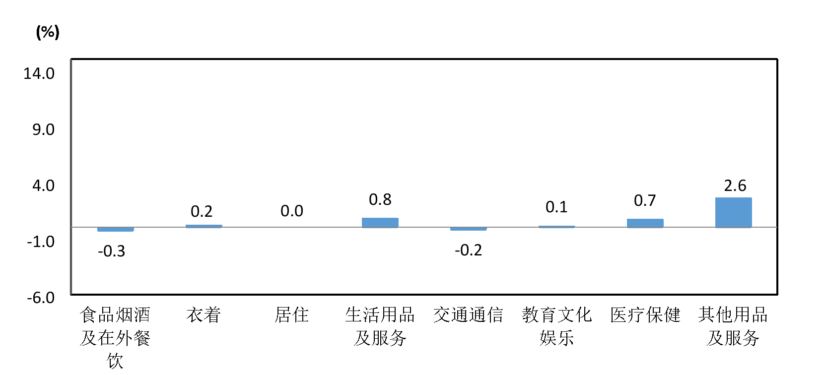 其他七大类价格环比五涨一降一平。其中,衣着、生活用品及服务、教育文化娱乐、医疗保健、其他用品及服务价格分别上涨0.2%、0.8%、0.1%、0.7%和2.6%;交通通信价格下降0.2%;居住价格与上月持平。