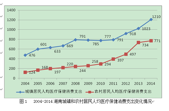 数据显示,2014年湖南城镇居民人均医疗保健支出1210元,比上年增加187元,增长18.3%,扣除价格因素实际增长15.0%,比居民消费支出实际增长速度快8.5个百分点。与2004年的476元相比,2014年湖南城镇居民人均医疗保健支出增长了154.2%(见图1),年均增长9.8%,占消费性支出的比重为6.6%,与2004年基本持平。
