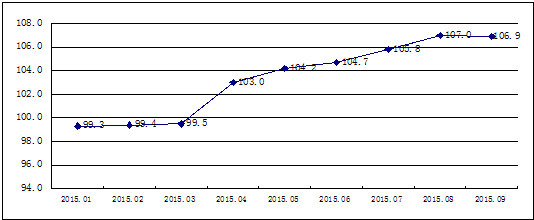 图1 2015年1-9月农业生产资料价格各月同比指数(上年同月价格为100)