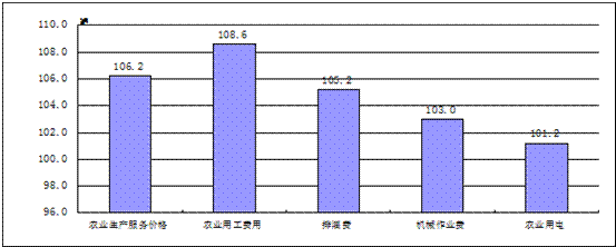 农业生产服务价格同比上涨6.2%,影响农业生产资料价格总指数上涨约0.88个百分点。其中,农业用工费用、排灌费、机械作业费和农业用电分别上涨8.6%、5.2%、3.0%和1.2%。
