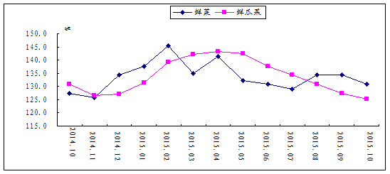 图3 鲜菜、鲜果价格变动情况(2010年12月价格=100)