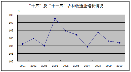 “十一五”时期,我国农业克服国际金融危机严重冲击、农产品价格大幅波动、自然灾害频繁发生等不利影响,继续保持了持续稳定发展的好势头,农林牧渔业全面发展,结构不断优化,传统农业向现代农业加速转变,强农惠农政策体系进一步完善,为保持经济的平稳较快增长和社会和谐稳定奠定了坚实的基础。