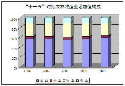 “十一五”以来,农、林、牧、渔各业在全面发展的同时,结构调整也不断深化,农产品优质率、生产集中度和加工转化水平明显提高。2010年与2006年相比,农林牧渔业增加值中,种植业的主业地位得到进一步增强,农业所占比重由56.4%上升到58.2%,提高了1.8个百分点;牧业所占比重由26.6%下降到24.9%,下降了1.7个百分点;渔业、林业比重略有下降,分别下降了0.7和0.1个百分点。