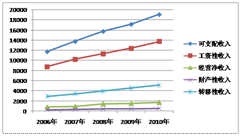 图1:2006-2010年全国城镇居民收入变化情况(单位:元)