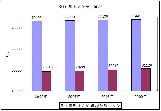 2009年末,我国就业人员总量达到77995万人,比“十五”期末的2005年增加2170万人,年均增加542.5万人。其中,城镇就业人员总量由27331万人增加到31120万人,年均增加947.3万人;乡村就业人员总量由48494万人减少到46875万人,年均减少404.8万人。