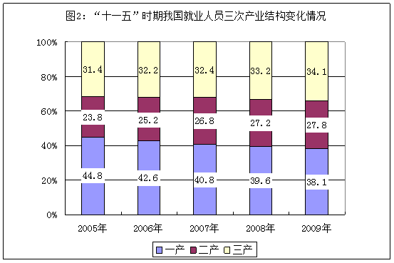 2、二、三产业就业人员比重继续提高。随着农业富余劳动力向非农产业的转移,我国二、三产业就业比重继续提高。“十一五”期间,我国第一产业就业人员由2005年的33970万人,减少到2009年的29708万人,年均减少1066万人;第二产业就业人员从2005年的18084万人,增加到2009年的21684万人,年均增加900万人;第三产业就业人员从2005年的23771万人,增加到2009年的26603万人,年均增加708万人。我国三次产业就业人员的比重由2005年的44.8:23.8:31.4转变为2009年的38.1:27.8:34.1,第一产业年均下降约1.7个百分点,比“十五”时期多降约0.7个百分点;第二产业年均上升1个百分点,比“十五”时期多升近0.8个百分点;第三产业年均上升0.7个百分点,略低于“十五”时期0.8的升幅。